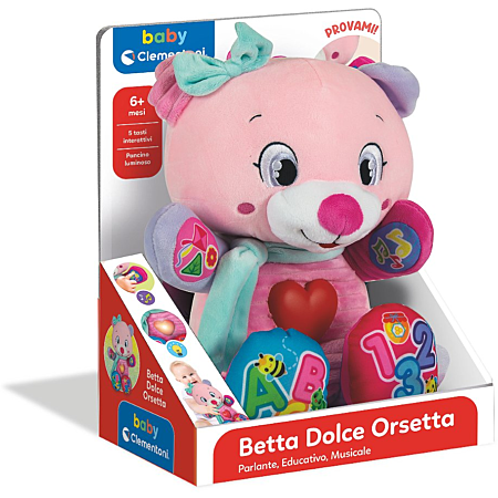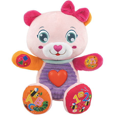 Une douce peluche parlante pour apprendre en s’amusant. Avec 5 boutons interactifs pour apprendre les premières lettres, les chiffres, les formes et les couleurs. Le cœur interactif est lumineux et permet d’écouter de joyeuses chansons et mélodies. Dès 6 mois. Fonctionne avec 2 piles AAA - LR03 incluses.