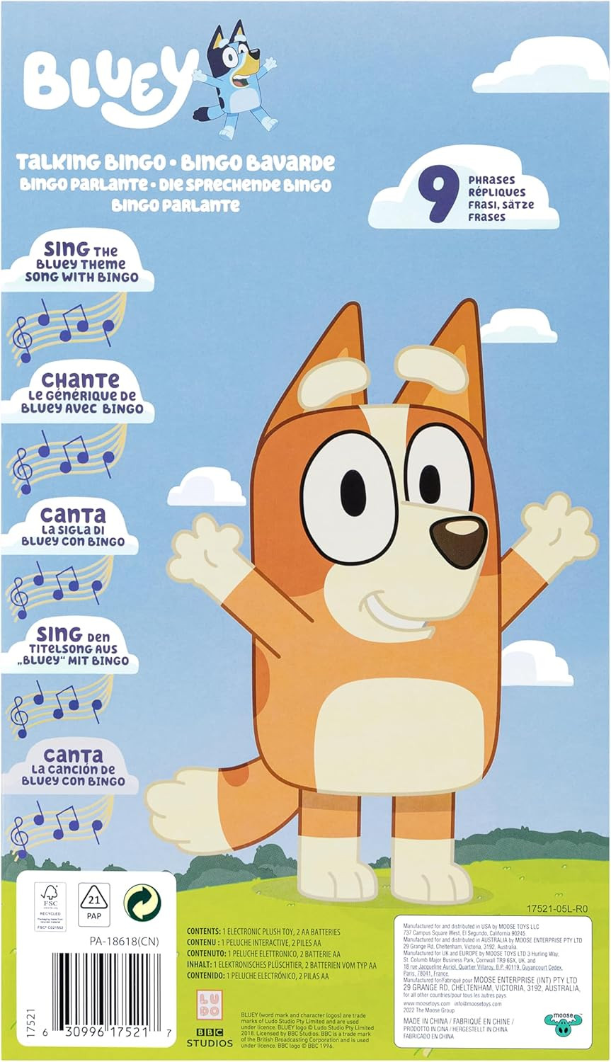 Appuie sur le ventre de Bingo pour la faire parler Chante le générique du dessin animé avec Bingo ! Bingo connaît 9 phrases différentes La peluche Bingo bavarde est conçue avec des tissus de qualité très doux et présente des finitions détaillées. Bingo mesure 30 cm