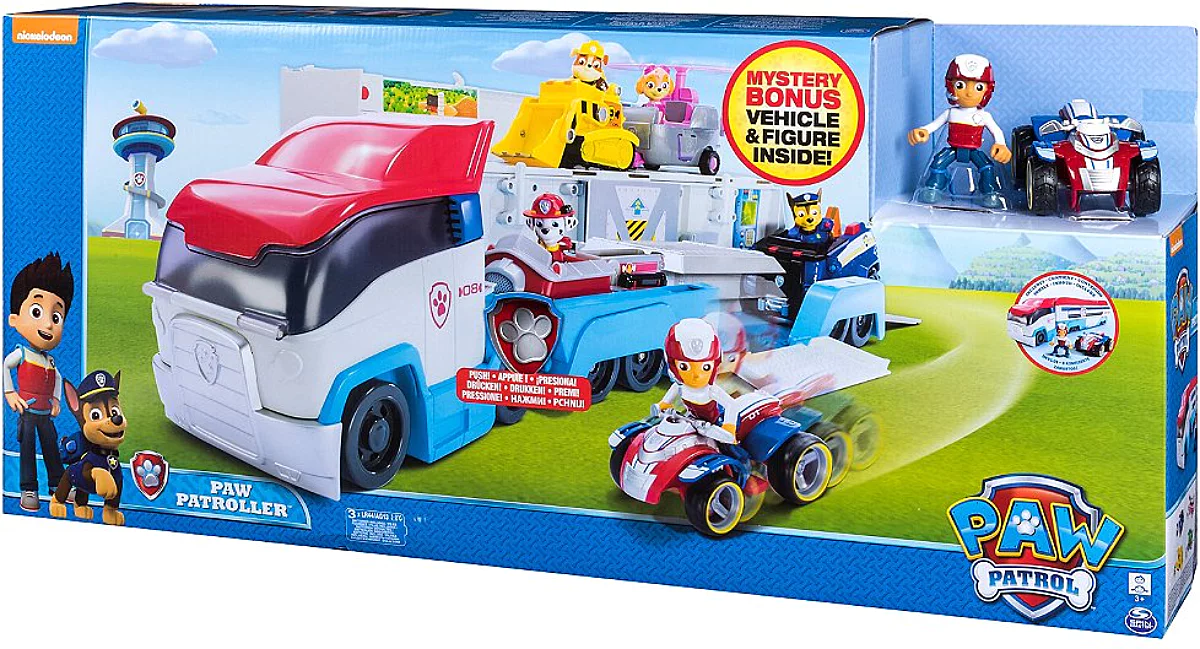 Véhicule interactif avec sons réalistes qui se transforme en centre de commandement. Peut accueillir jusqu’à 6 véhicules et figurines. 1 figurine de Ryder et son véhicule inclus. 3 piles LR44 fournies. Dès 3 ans.