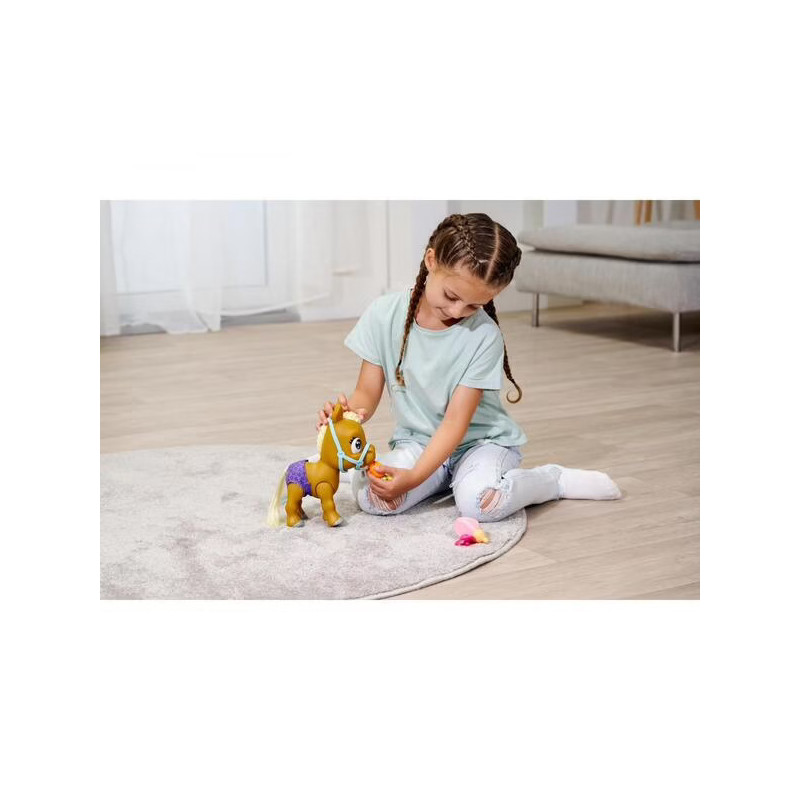 Cet animal interactif peut boire correctement grâce à son biberon, puis mouille son petit lange : si le paquet est humide, l’intérieur devient jaune comme un vrai. Une marque de naissance magique permet aussi de découvrir son genre : il suffit de la nettoyer avec un peu d’eau pour voir apparaître un cœur bleu ou rose. Le poney possède une belle queue blonde que les enfants peuvent peigner et accessoiriser avec une bride, et même ses sabots sales peuvent être nettoyés grâce à l’outil fourni. Le coffret contient le poney de 24cm, des accessoires de soin et de nourriture ainsi qu’un certificat d’adoption pour rendre le jeu encore plus réaliste et affectueux. Un compagnon idéal pour développer l’imagination et l’empathie des enfants.
