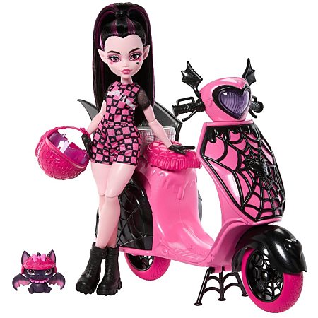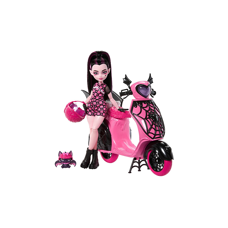 Monster High Coffret Draculaura et son scooter avec poupée Draculaura, chauve-souris Comte Fabulous, véhicule rose et noir et casques