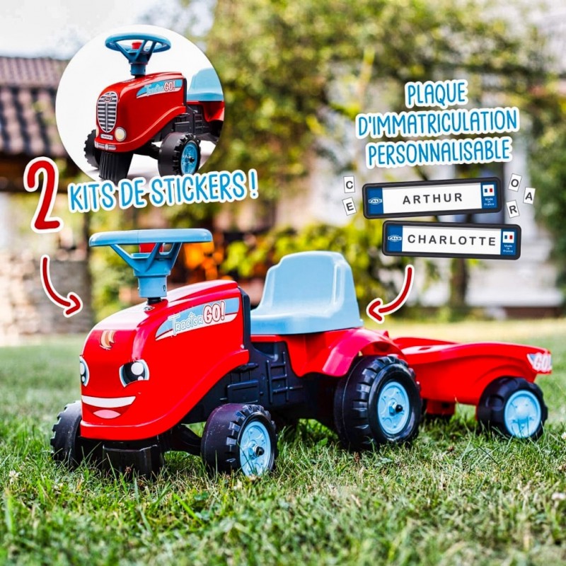 Porteur Tracteur Go ! rouge équipé d'un volant directionnel avec klaxon, d'une mini remorque et d'un kit adhésifs supplémentaires inclus - 100% made in France pour les petits jardiniers de 1 à 3 ans.
