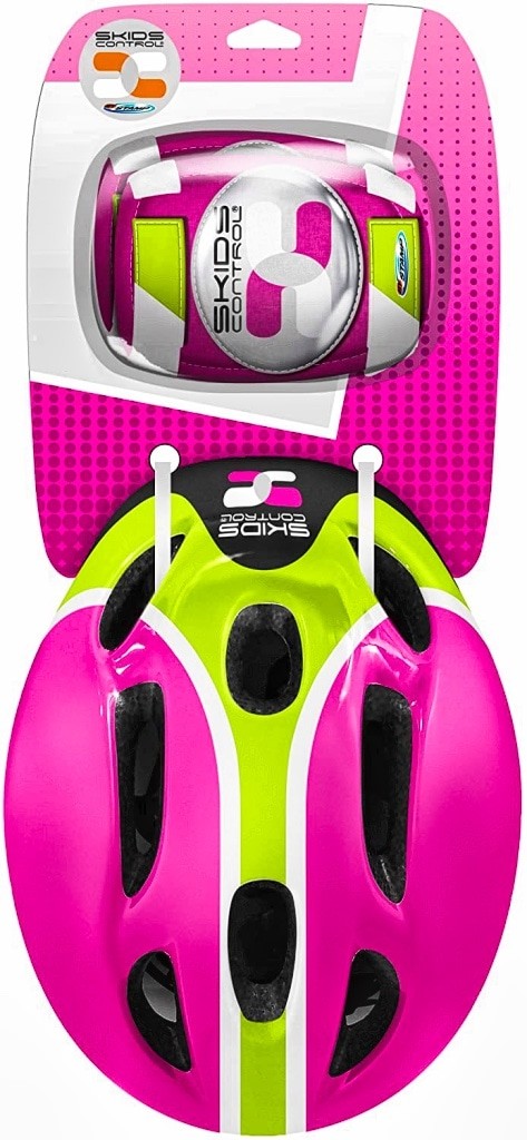 Casque cycle, roller, trottinette, patins à roulette, skateboard. Tour de tête réglable avec système de molette head ring assurant maintien et confort. Réglable 53/56cm. Sangles jugulaires ajustables. Aérations. Mousses interne pour plus de confort. Structure EPS. Coudières/genouillères avec coque blister, ajustables via velcro. Coloris: rose/vert