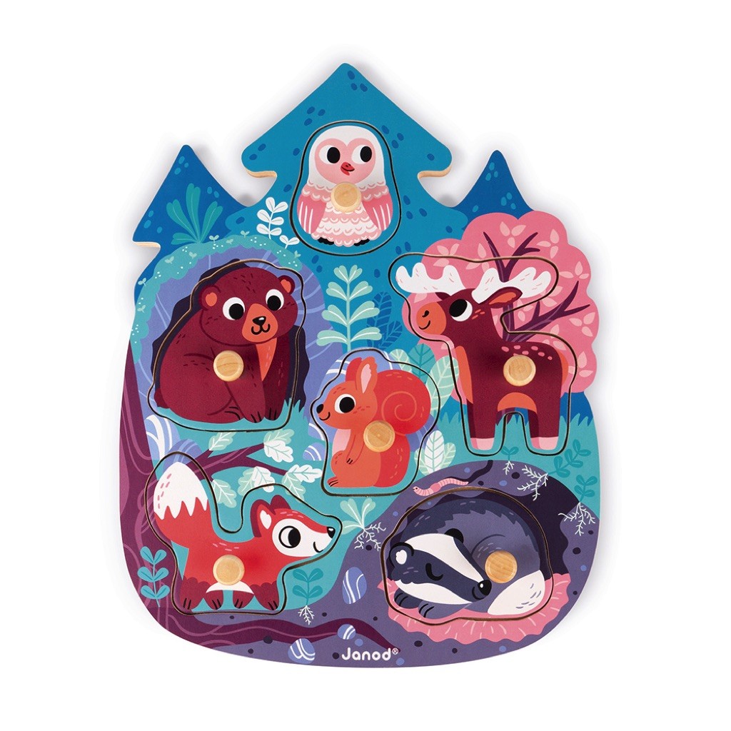 Puzzle 6 pièces avec tenons en bois sur le thème des animaux de la Forêt.