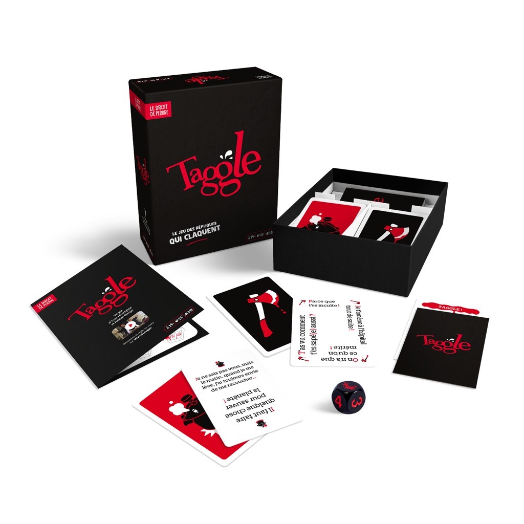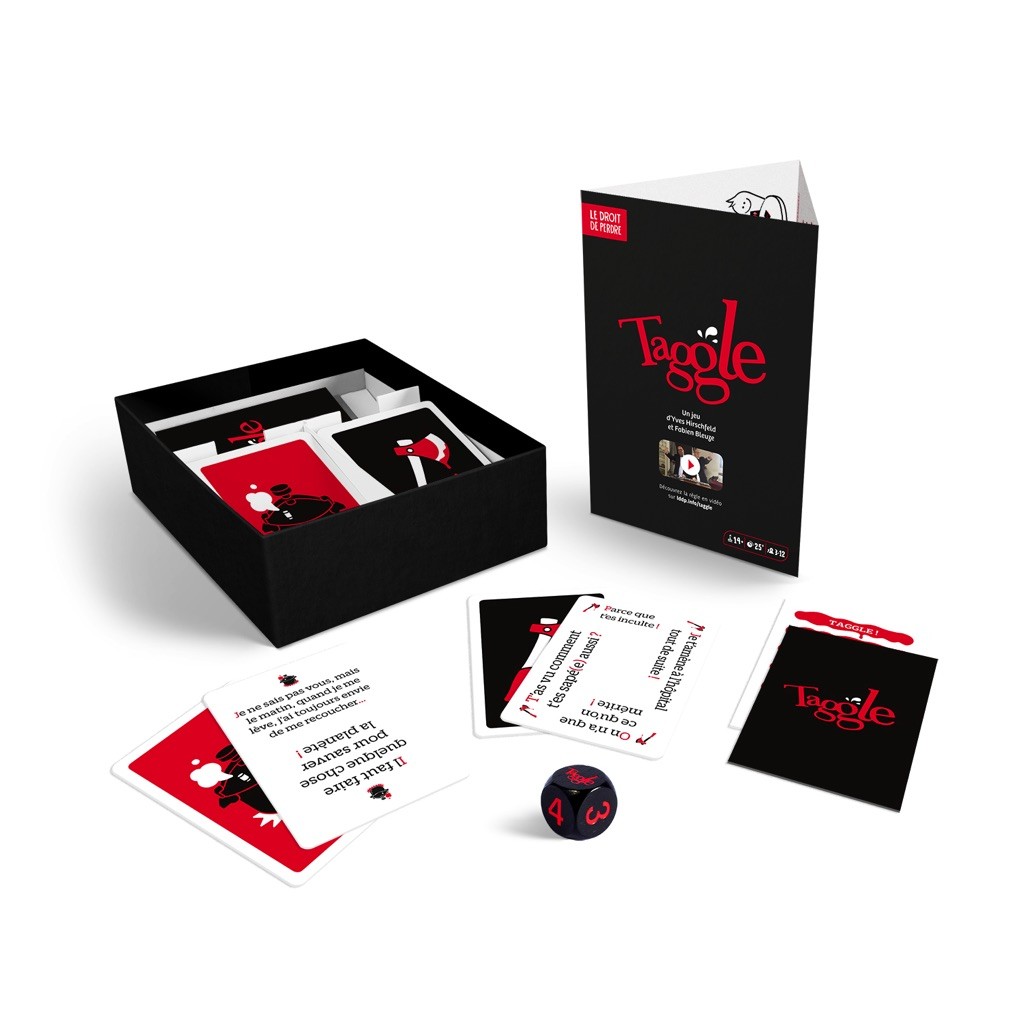Taggle, c'est très drôle et c'est très simple ! Un meneur prend des cartes réflexions pour lire une réflexion diiférente à chacun des autres joueurs, qui lui répondent aussitôt avec la meilleure réplique de leur carte. Cela donne des dialogues déjantés, à jouer en mettant le ton, tels que : "Je crois que je t'aime" (réflexion) / "C'est parce que t'as pas fait la guerre..." (réplique), ou : "Y a plus de papier !" / "T'en as parlé à ta mère ?" A la fin de son tour, le meneur dit "Taggle !" au joueur qui lui a donné, à son goût, la moins bonne réplique. A chaque "Taggle !" reçu, un joueur baisse d'un cran sur son compteur et, au bout de six "Taggle !", il atteint le stade "Casse-toi boulet !" et la partie est terminée !