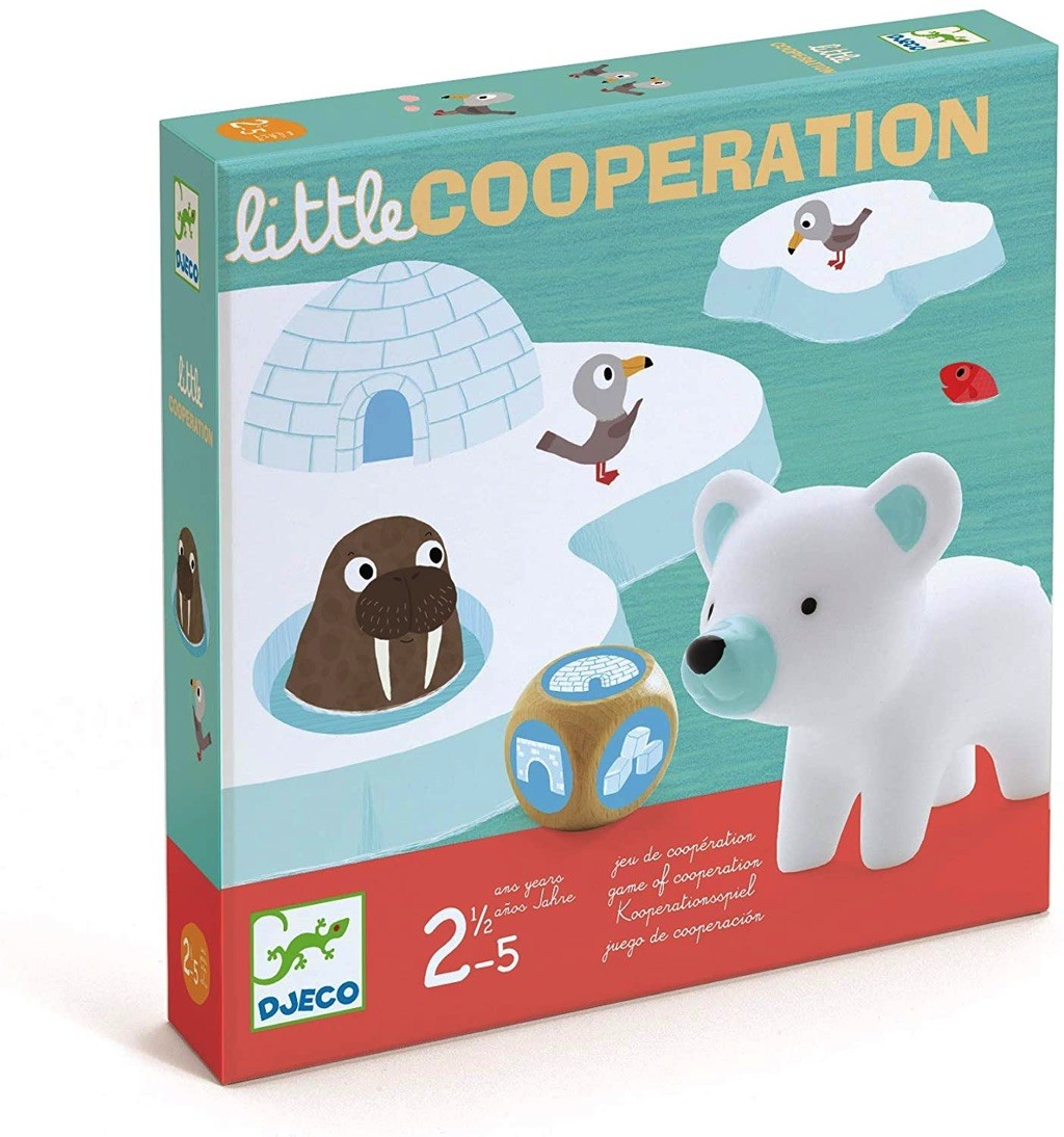 Découvrez Little coopération de Djeco, un jeu coopératif pour apprendre à jouer et à gagner tous ensemble pour les enfants de 2 ans et demi à 5 ans. Sur la banquise, 4 petits animaux tentent de regagner leur igloo. Attention, car le pont de glace menace de s'écrouler! Le jeu se compose de 3 plateaux de jeu (1 plateau de départ « pêche », 1 pont de glace, 1 plateau d’arrivée « igloo »), 1 pont, 6 piliers en bois, 4 animaux en plastique, 1 dé et la règle de jeu. La promesse de vrais moments d'échange et de complicité entre les tout petits et leurs parents.