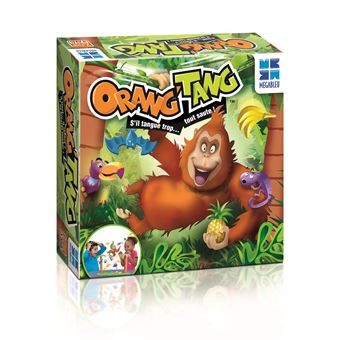 S’il tangue trop, il fait tout tomber ! À tour de rôle, les joueurs lancent le dé et découvrent ce qu’ils doivent accrocher à ORANG TANG : un fruit ou un animal, léger ou lourd ? Le hasard décide, mais il faut bien observer l’équilibre d’ORANG TANG suspendu à sa corde, pour choisir le meilleur endroit possible où disposer l’objet et garder cet animal malicieux en équilibre. Sinon TWANNNNG ! Il est éjecté de sa corde et envoie tout en l’air ! Et le joueur a perdu. Un jeu de belle facture, plein de suspense et de surprise ! Contenu:. un orang-outan, 2 palmiers avec un fil, 2 bases, 1 dé, 14 pièces à suspendre (2 ananas, 6 grappes de bananes, 2 chauve-souris, 2 lézards, 2 noix de coco), règles du jeu.