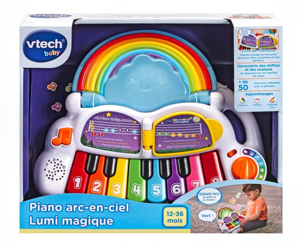 Piano arc-en-ciel Lumi Magique : de 12 à 36 mois. 8 touches colorées pour jouer de la musique mais aussi découvrir les chiffres en anglais et en français, et les couleurs. 2 pages de partitions pour de nombreux apprentissages en chanson Magique ! Le nuage orientable s'illumine au rythme de la musique de la même couleur que les touches de piano. Un curseur pour sélectionner 2 jeux et 8 modes de piano pour découvrir plein de sons amusants et apprendre les chiffres et les couleurs Plus de 50 chansons, mélodies, sons et phrases. 18 chansons et mélodies. Réglage du volume sonore. Fonctionne avec 2 piles LR6/AA fournies