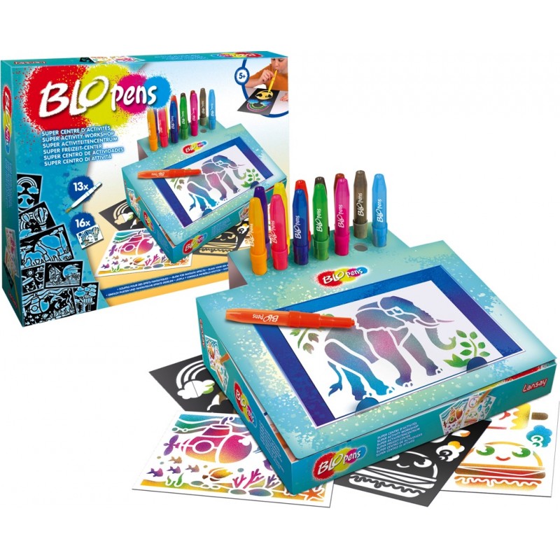 Les Blopens sont des feutres fantastiques ! Utilise un pochoir, souffle dans le stylo et regarde ton dessin apparaître ! Tu peux aussi colorier avec la pointe, comme avec des feutres classiques. Transforme ta boîte en pupitre, place tes Blopens et c’est parti pour la création ! Un super coffret pour des dessins au rendu aérographe impressionnant ! Place ta feuille de dessin sur le pupitre et réalise de beaux dessins emoji et kawaii, de magnifiques animaux comme l’éléphant, ou encore un décor de l’espace. Pratique, tu peux ranger tes Blopens, tes pochoirs et tes dessins à l’intérieur de la boîte ! Avec Blopens, tu as tout pour devenir un véritable artiste !