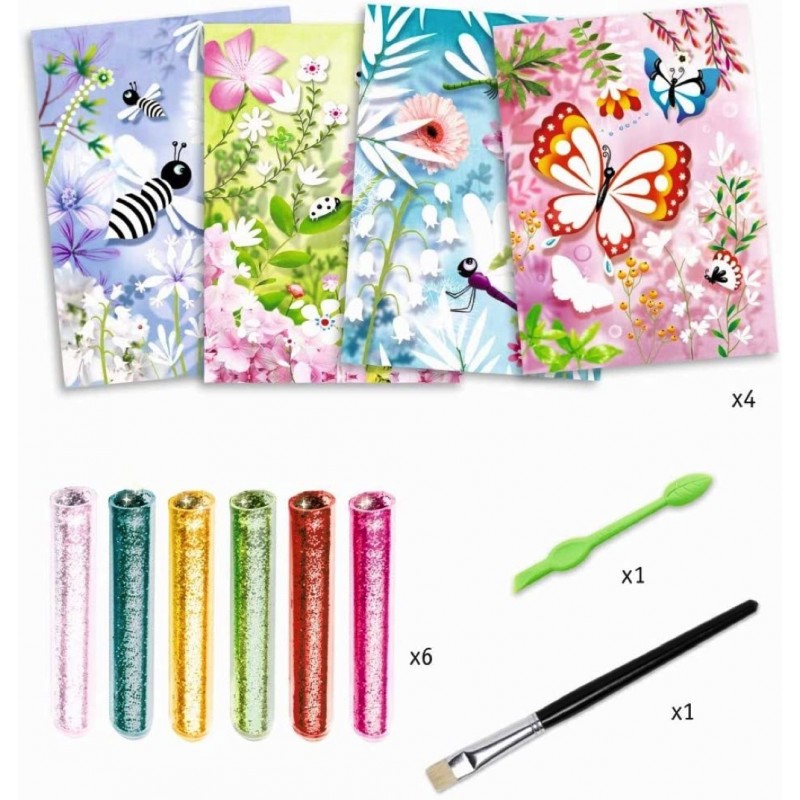 Djeco vous présente ses tableaux à pailleter papillons pour illuminer les dessins. Une activité créative et ludique pour les enfants de 7 à 13 ans. Un outil pour dévoiler les parties encollées, puis vous verser les paillettes directement des pipettes et récupérer le surplus par le petit trou de la boîte à l'aide du pinceau. Couleur après couleur, vos tableaux seront réalisés et brilleront sous l'effet des paillettes.