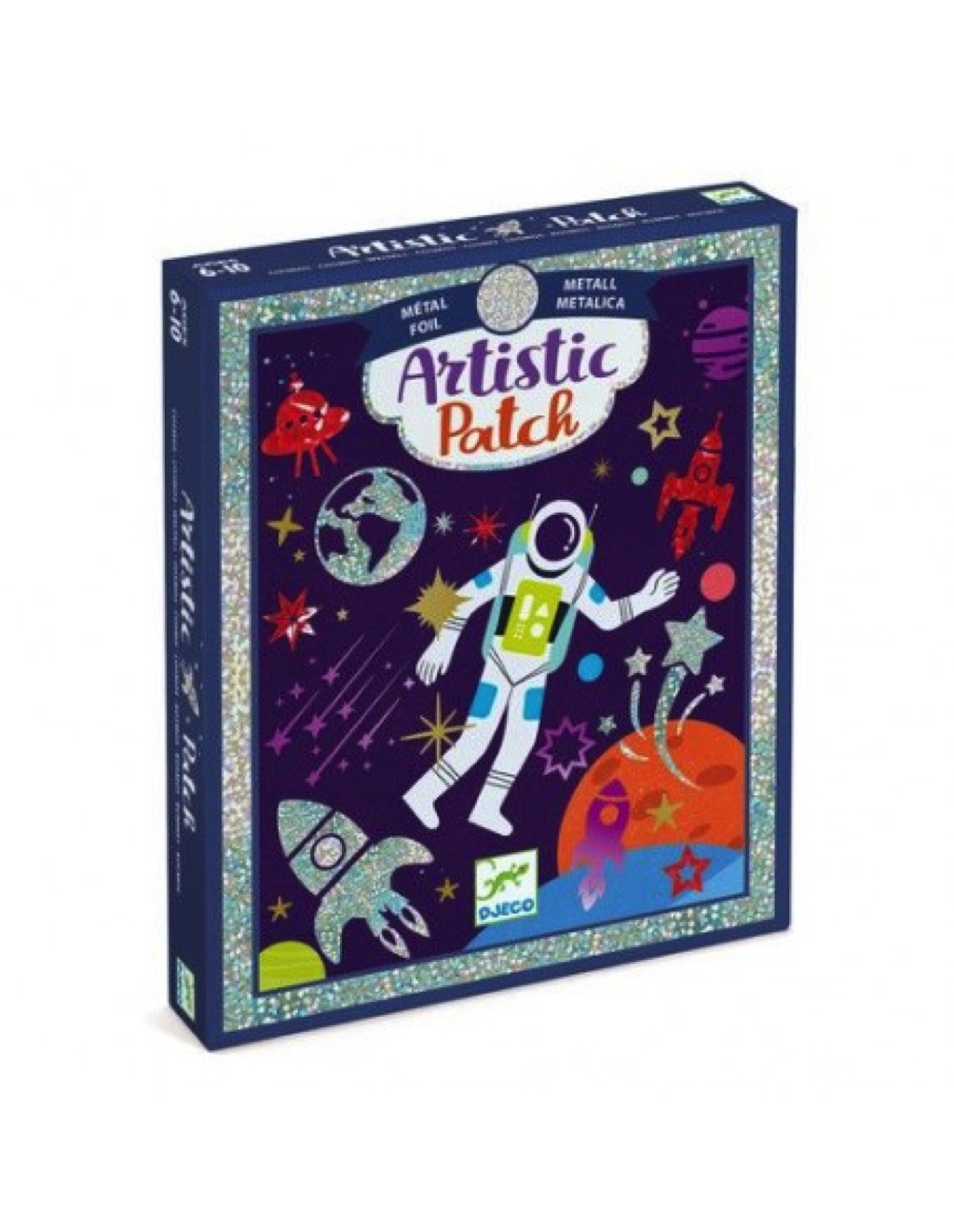 Découvrez le coffret artistic patch Cosmos de Djeco, un coffret créatif avec du papier métallisé pour les enfants de 6 à 10 ans sur le thème de l'espace. Des petits patchs à coller sur les cartes illustrées ou sur des cahiers à illuminer avec du métal. La collection Artistic Patch de Djeco propose une création en 2 étapes : appliquer le patch de colle puis déposer la matière (paillettes, velours ou effet métallisé). Une activité originale et divertissante sans en mettre partout.