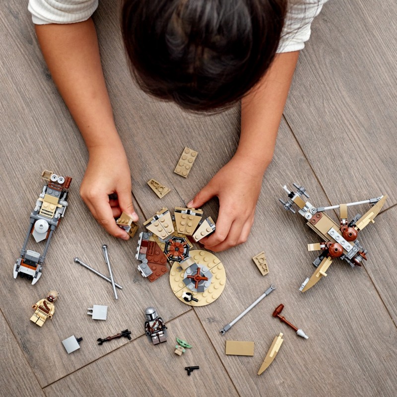 Il inclut le speeder bike du Mandalorien avec un siège pour une figurine LEGO et une sacoche dans laquelle l’Enfant peut prendre place, mais aussi une hutte Tusken à construire et une baliste lance-missile pour le pillard Tusken (nouveauté de janvier 2021)Jeu de rôleCe modèle inclut le Mandalorien, le Tusken Raider et l’Enfant (affectueusement appelé Bébé Yoda) LEGO ainsi que des armes surprenantes qui favorisent le jeu de rôle.