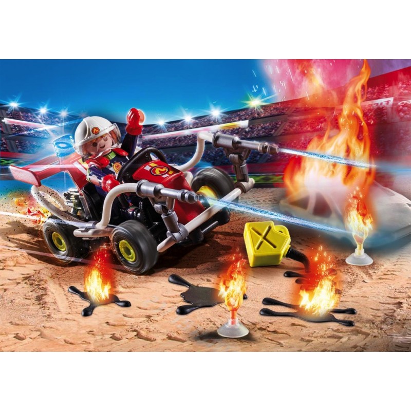L'incroyable Stuntshow Playmobil est l'évènement où tous les cascadeurs rêvent de performer ! Ce spectacle haut en couleurs impressionnera tous les fans de cascade et de vitesse, les petits comme les grands ! Avec son gyrophare et sa vitesse fulgurante, le kart pompier se retrouve sur les lieux des incendies avant tout le monde et éteint rapidement les feux grâce à ses deux lances à incendie. Pratique, lorsqu'un bidon d'essence se renverse et prend feu pendant le show. Contient un personnage, un bidon, un gant, un casque et un kart pompier avec ses deux lances à incendie. Dimensions : 12 x 7 x 6 cm (LxPxH)