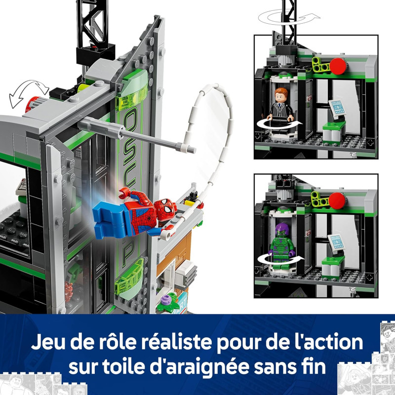 Jeu de construction pour garçon ou fille dès 10 ans avec minifigurine collector de Spider-Man – Ce set est un jouet LEGO ǀ Marvel spectaculaire pour les enfants, fans de super-héros, à constuire en famille Minifigurines de super-héros – Le set de construction inclut 8 minifigurines LEGO : Spider-Man, Spider-Woman, Miles Morales, Eddie Brock, Ghost-Spider, Norman Osborn, Kraven le chasseur et le Bouffon vert Scène urbaine composée de plusieurs maquettes – L’action se déroule à l’intérieur et à l’extérieur de 3 bâtiments : l’appartement de Miles Morales, l’immeuble d’Oscorp et l’appartement de Venom Jeu de rôle réaliste – Ce jouet de construction inclut une moto, un planeur, des armes, des accessoires adaptés à chaque pièce et des tiges transparentes permettant de positionner les personnages Cadeau pour un garçon ou une fille dès 10 ans, fan de Spider-Man – Ce set est un fabuleux cadeau modulaire à offrir aux fans de super-héros, de jouets Marvel collector et de maquettes LEGO Construire ensemble, entre amis et en famille – Cette maquette peut être combinée avec le set L’appartement de Peter Parker (76317) ; l'application LEGO Builder offre une expérience collaborative permettant de partager le plaisir de la construction Jouets à construire LEGO ǀ Marvel – La vaste gamme de sets LEGO ǀ Marvel offre aux enfants un univers d’aventures infinies, de construction et de jeux créatifs avec des super-héros